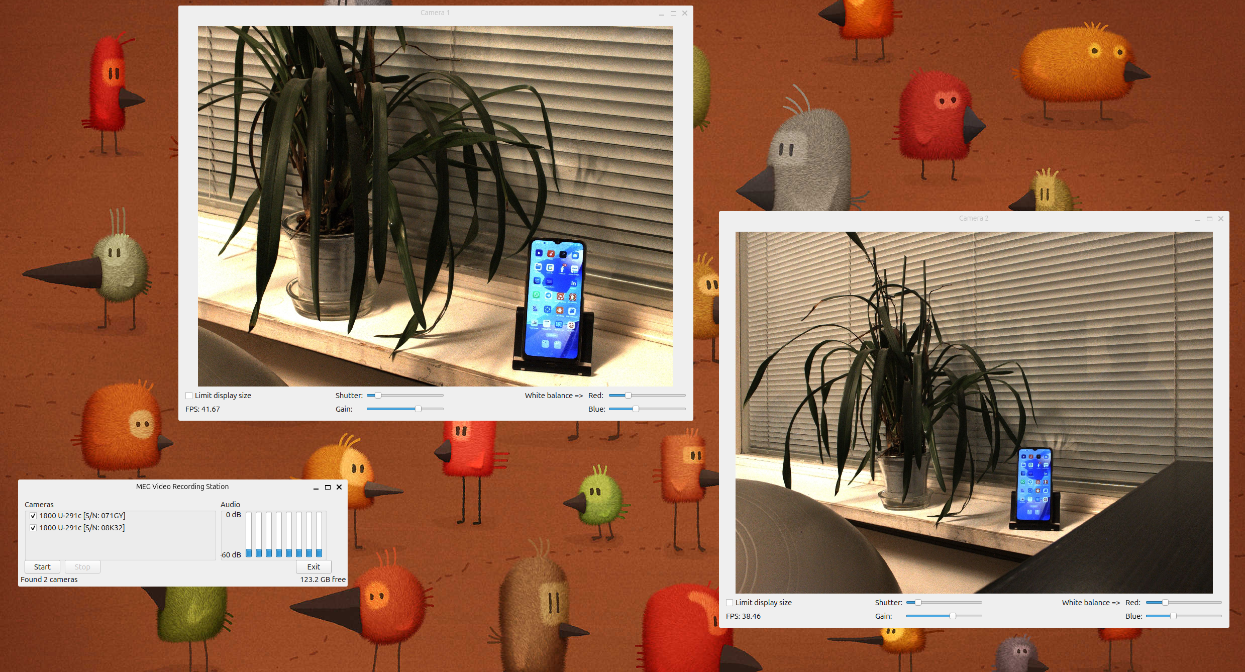 You can activate/deactivate each camera by clicking the corresponding checkbox in the list. When a camera is activated, the program will open a window showing the live video feed from that camera. You can adjust some video settings (shutter speed, gain, white balance) for the camera by dragging the sliders in the camera window. Once you are satisfied with the video settings, you can start recording by clicking the “Start” button and stop recording by clicking the “Stop” button. The video and audio data will be saved to files in the directory specified in the configuration file (see [misc] section for details).